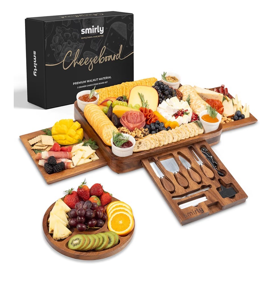 Impress guests with SMIRLY's walnut wood cheese board and large charcuterie board. Designed for easy entertaining, it perfectly displays a variety of delicious treats, including meats, cheeses, crackers, veggies, and fruits. Our cheese boards charcuterie boards gift set includes a matching bamboo fruit tray for added versatility. Use our free guide to design stunning cheese platters that impress. Packaged in a decorative box, it's an ideal gift for any occasion.