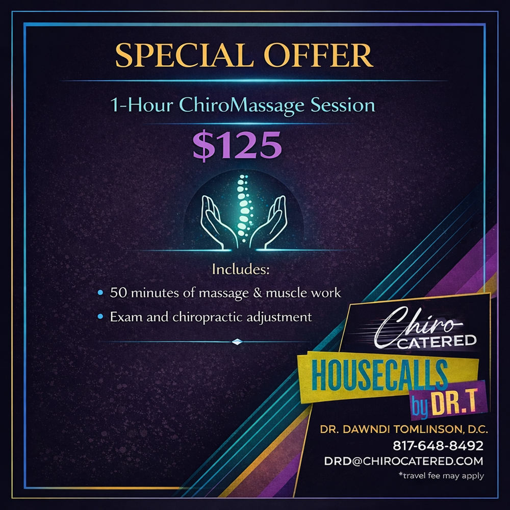 Enjoy a customized 1-hour ChiroMassage session with Dr. T, combining therapeutic massage and chiropractic care for total-body relief. Includes: • 50 minutes of massage and muscle work • Examination and chiropractic adjustment This comprehensive session is designed to help reduce tension, improve mobility, and leave you feeling refreshed and restored.